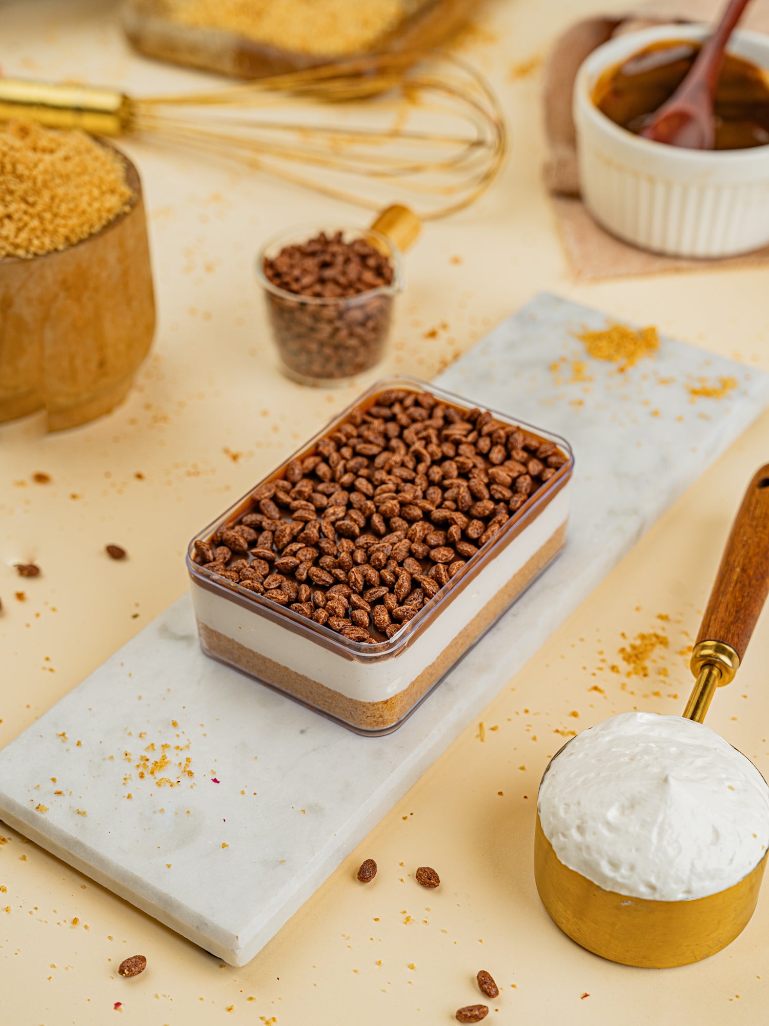 A perfectly crisp biscuit crust, a rich and creamy secret cheesecake filling, and a smooth, velvety layer of decadent chocolate.