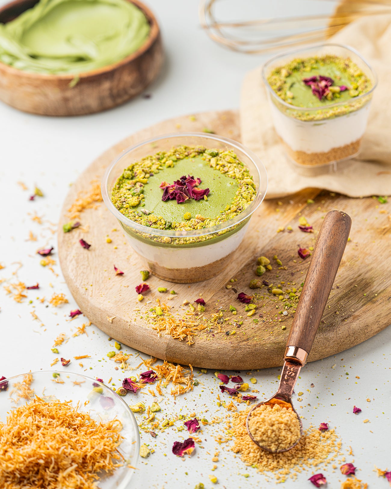 Velvety pistachio cheesecake with a buttery crust – a perfect blend of sweet and nutty.